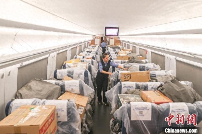 2024年11月11日,南昌西站,中铁快运的工作人员在高铁车厢内检查摆放好的包裹货物。刘力鑫摄